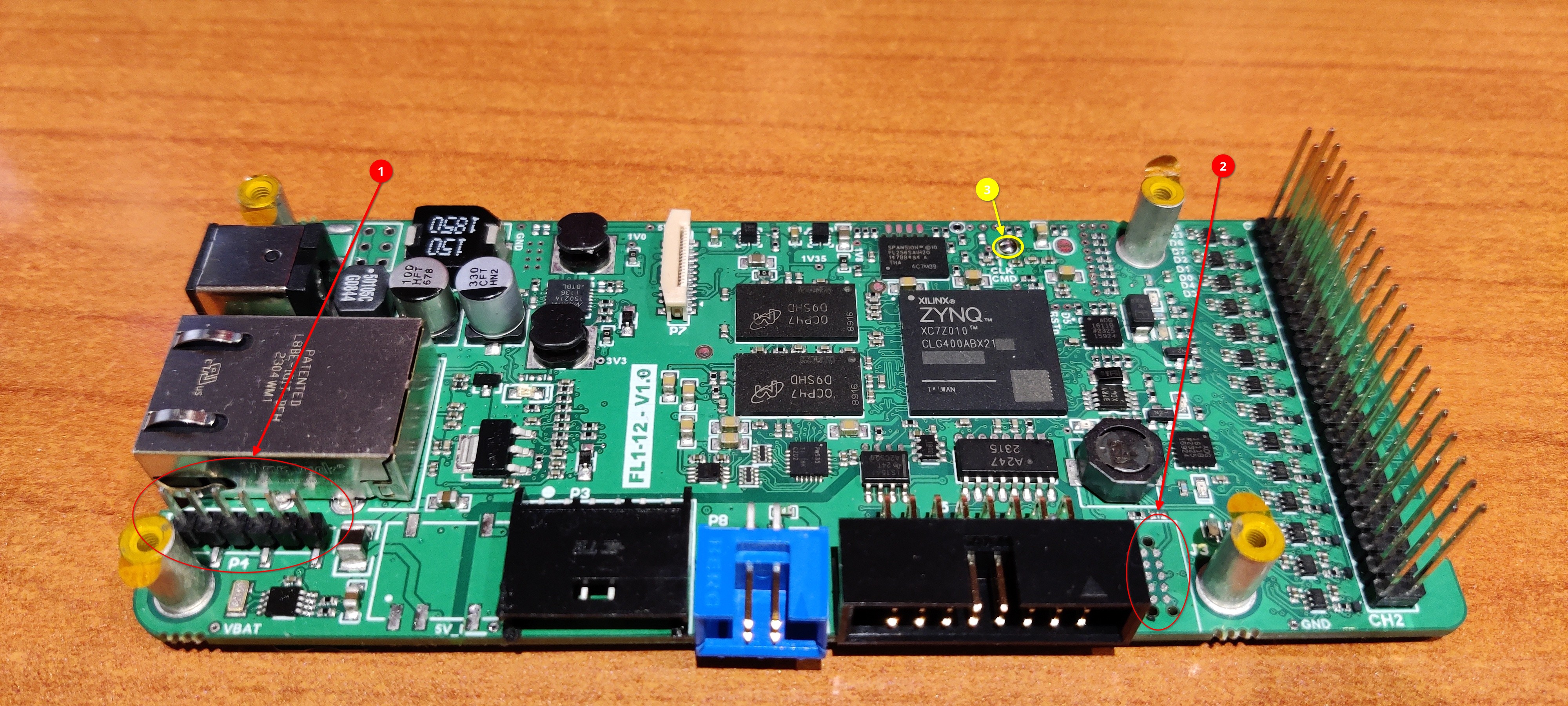 - On the left the arrow marked (1) point to the serial interface for debug. The Pin 1 in near the edge of the board (This is the ground signal, black cable on FTDI cable connector)